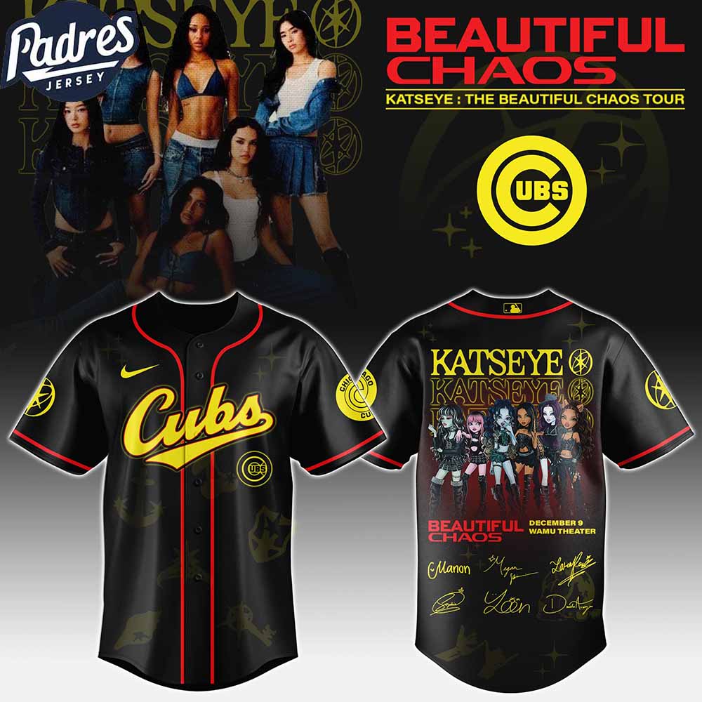 The Chicago Cubs x Katseye The Beautiful Chaos Tour custom jersey celebrates the perfect mix of baseball heritage and pop-culture energy. Featuring bold CUBS lettering in radiant gold outlined with red on a deep black background, this design commands attention. The back showcases KATSEYE’s Beautiful Chaos Tour artwork with printed autographs from every member, creating a true collector’s edition. Crafted from lightweight, breathable materials, it offers superior comfort and modern appeal. Whether worn at Wrigley Field or a live concert, this limited-edition jersey embodies confidence, style, and passion — uniting Cubs pride with KATSEYE’s fearless Beautiful Chaos spirit.