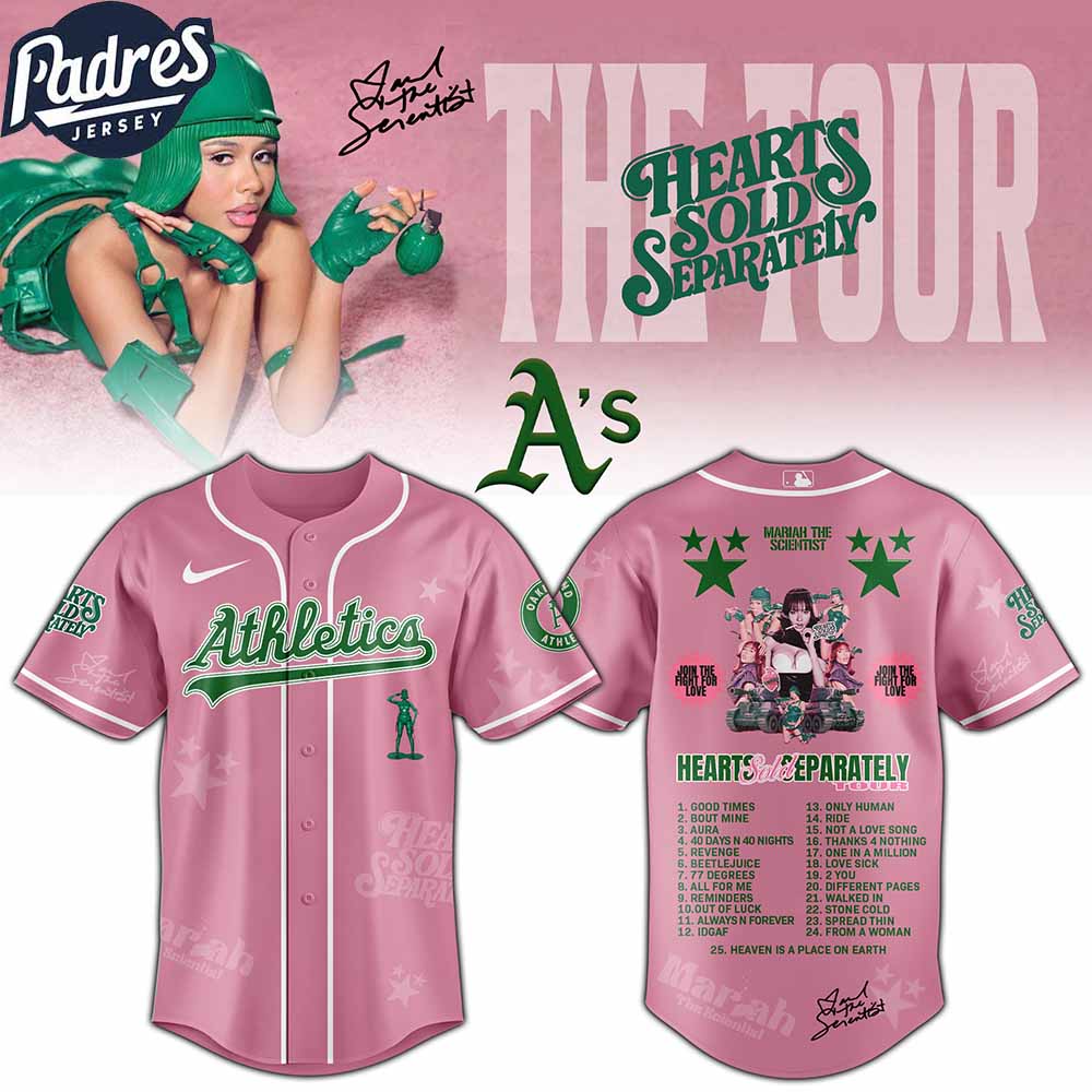 The Oakland Athletics x Mariah the Scientist tour custom jersey blends tradition and creativity. Styled in pink with white piping and bold green Athletics lettering, it reimagines the classic baseball jersey. The back features colorful artwork and the tour’s complete setlist, offering Athletics fans a collectible item that celebrates both the game and music culture.