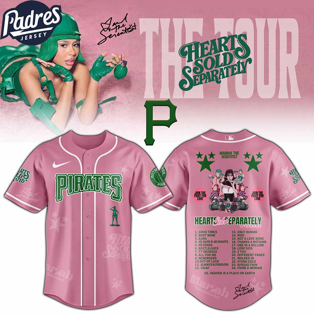 This Pittsburgh Pirates custom tour baseball jersey combines bold style with music culture. Designed in pink with white piping and striking green Pirates lettering, it gives a modern twist to the classic jersey. The back features Mariah the Scientist’s Hearts Sold Separately artwork and full setlist, making it a unique collector’s piece for both Pirates fans and music lovers.
