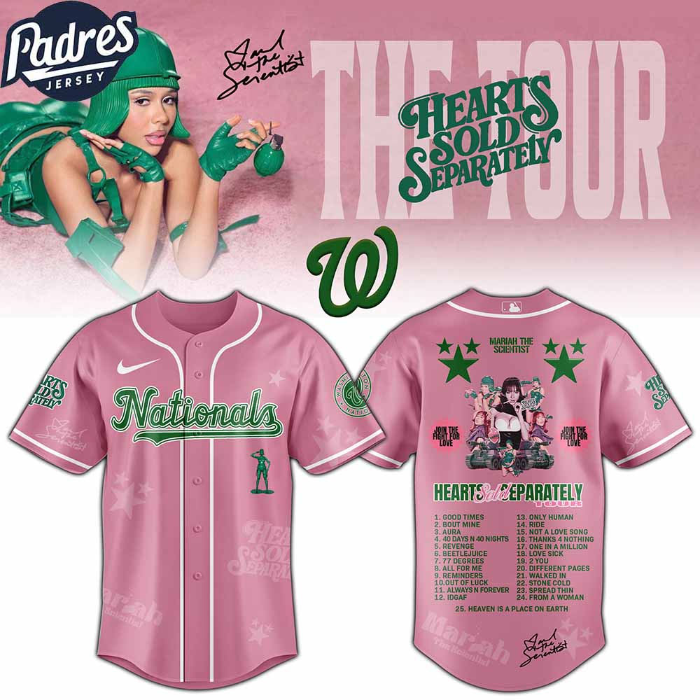 This Washington Nationals custom baseball jersey blends sports and music culture with a vibrant tour-inspired design. The pink base is accented with white piping and bold green Nationals lettering across the front. On the back, unique artwork and a full setlist from Mariah the Scientist’s Hearts Sold Separately tour make it stand out as more than just fan gear. Perfect for Nationals supporters and music lovers alike, this jersey combines comfort, style, and collectible appeal.